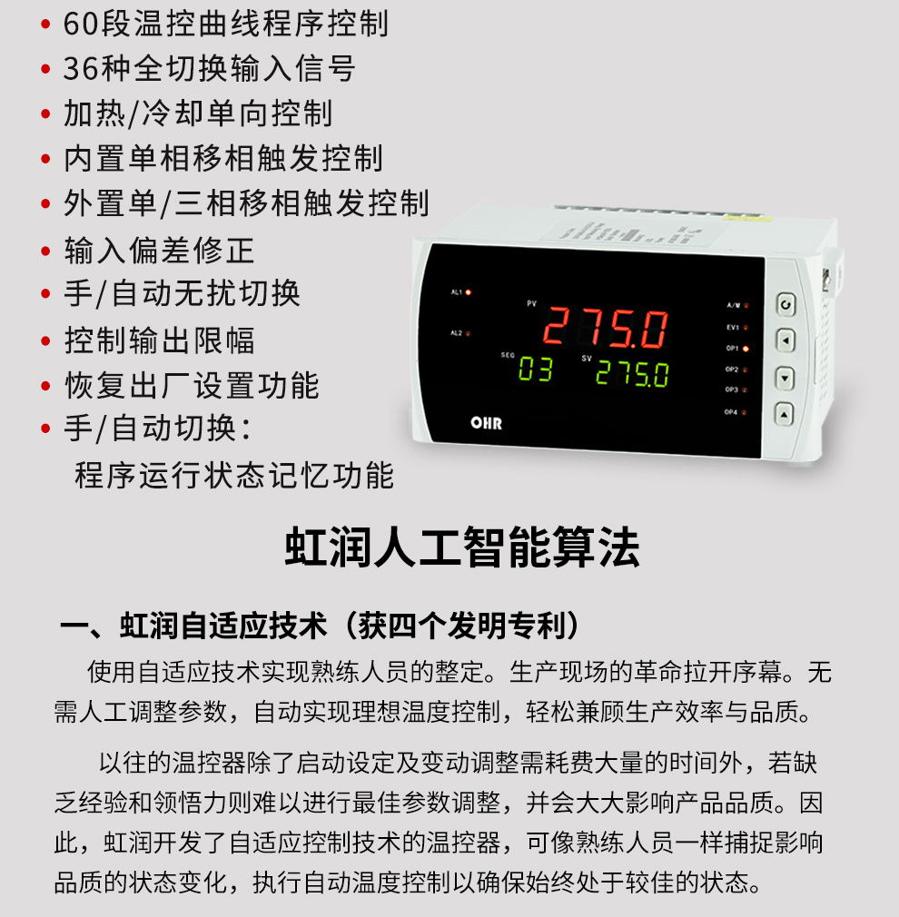 虹潤公司是專業(yè)生產(chǎn)溫控器的國家專精特新“小巨人”企業(yè)。生產(chǎn)的程序段智能溫控器,具有真正人工智能算式,無需人工整定參數(shù),控制精度可達±0.1°C,60段溫控曲線程序,無超調(diào)、欠調(diào)等特點。產(chǎn)品獲得模糊PID控制儀及控制方法、人工智能調(diào)節(jié)器、智能化控制器、移相觸發(fā)控制器、閥門自動手動無擾動操作控制方法及裝置等5項國家發(fā)明專利,主持起草智能溫度儀表通用技術條件、工業(yè)過程控制系統(tǒng)用模擬輸入兩位或多位輸出儀表、工業(yè)過程測量和控制系統(tǒng)用智能調(diào)節(jié)器等3項國家標準,,以及通信系統(tǒng)多通道數(shù)據(jù)采集控制終端規(guī)范軍用標準,參與國際5G標準制定,取得60段PID自整定調(diào)節(jié)器等3項相關軟件著作權。產(chǎn)品廣泛應用于電力、石化,冶金、制藥、食品等幾乎所有工業(yè)現(xiàn)場,實現(xiàn)精準控溫,保障生產(chǎn)安全與質(zhì)量。