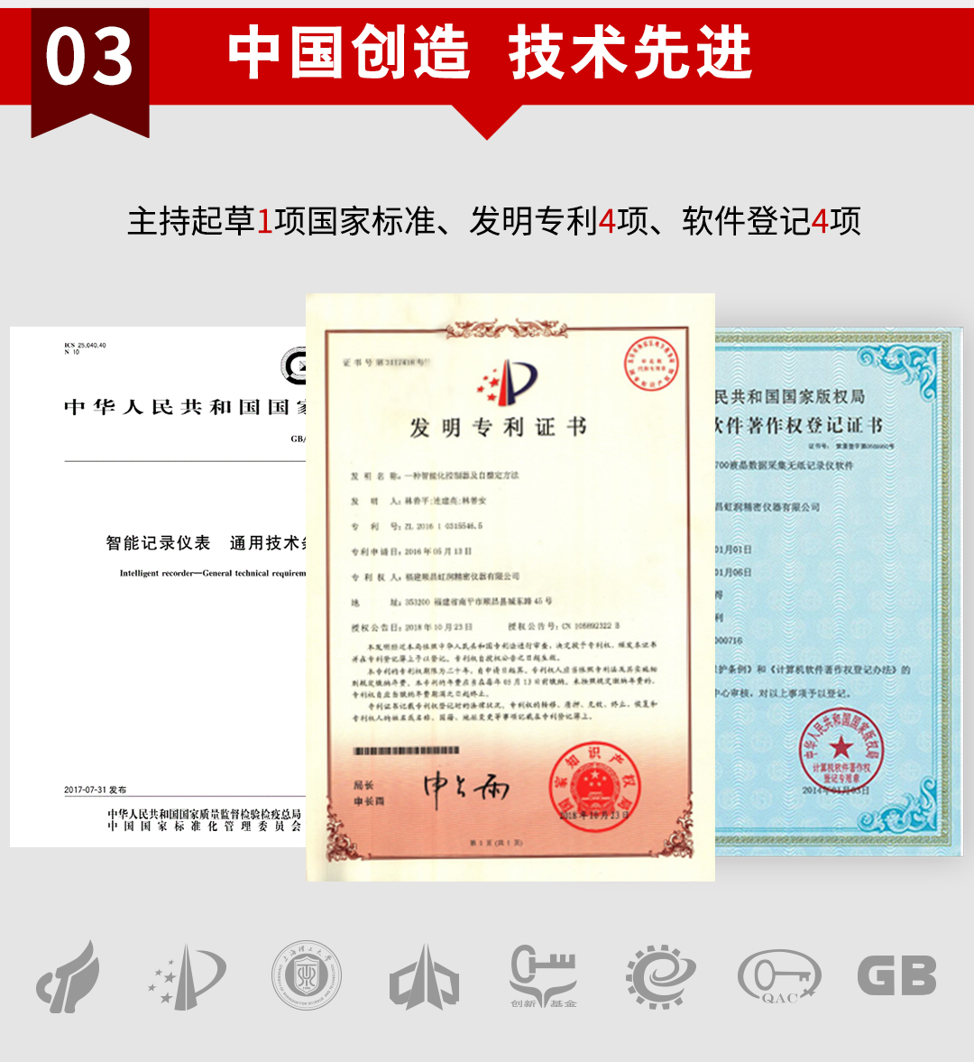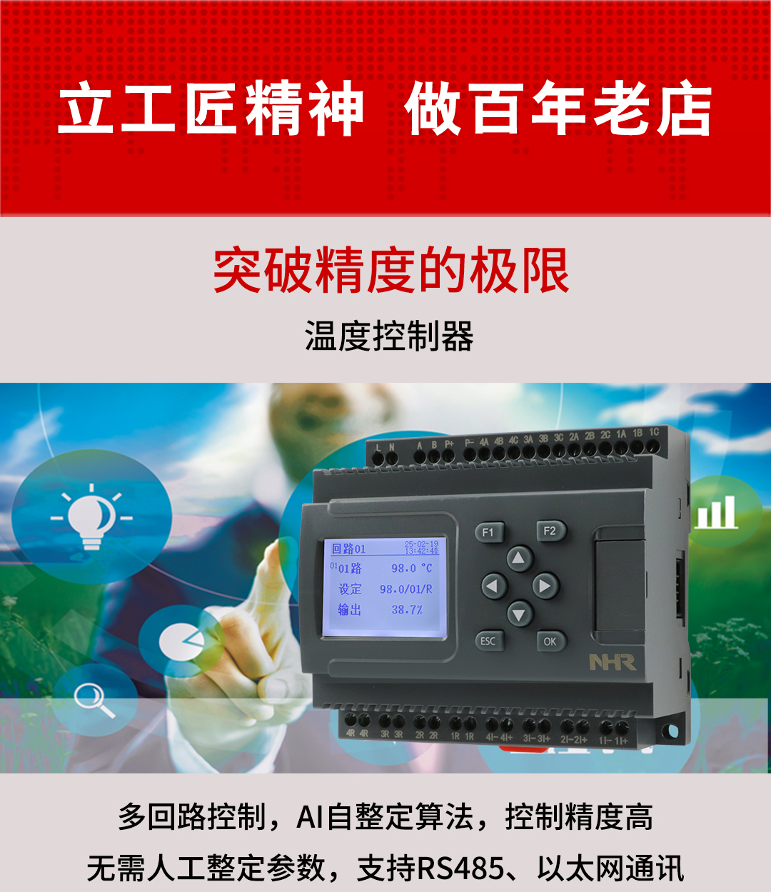 虹潤公司是專業(yè)生產(chǎn)溫控器的國家專精特新“小巨人”企業(yè)。生產(chǎn)的溫度控制器,具有4路或8路PID控制,真正人工智能算式,無需人工整定參數(shù),控制精度達(dá)士0.1°C,數(shù)據(jù)記錄與轉(zhuǎn)存等特點(diǎn)。產(chǎn)品獲得智能化控制器、人工智能調(diào)節(jié)器及調(diào)節(jié)方法、模糊PID控制儀及控制方法、一種平板無紙記錄儀、巡回檢測顯示方法及裝置等5項(xiàng)國家發(fā)明專利,主持起草物聯(lián)網(wǎng)智能記錄儀表、物聯(lián)網(wǎng)智能溫度儀表、工業(yè)過程測量和控制系統(tǒng)用智能調(diào)節(jié)器等3項(xiàng)國家標(biāo)準(zhǔn),參與國際5G標(biāo)準(zhǔn)制定,取得液晶溫控器儀表等3項(xiàng)相關(guān)軟件著作權(quán)。產(chǎn)品廣泛應(yīng)用于電石化、工業(yè)爐、試驗(yàn)設(shè)備、注塑機(jī)械、包裝機(jī)械等需要對現(xiàn)場溫度進(jìn)行監(jiān)測控制的行業(yè)。