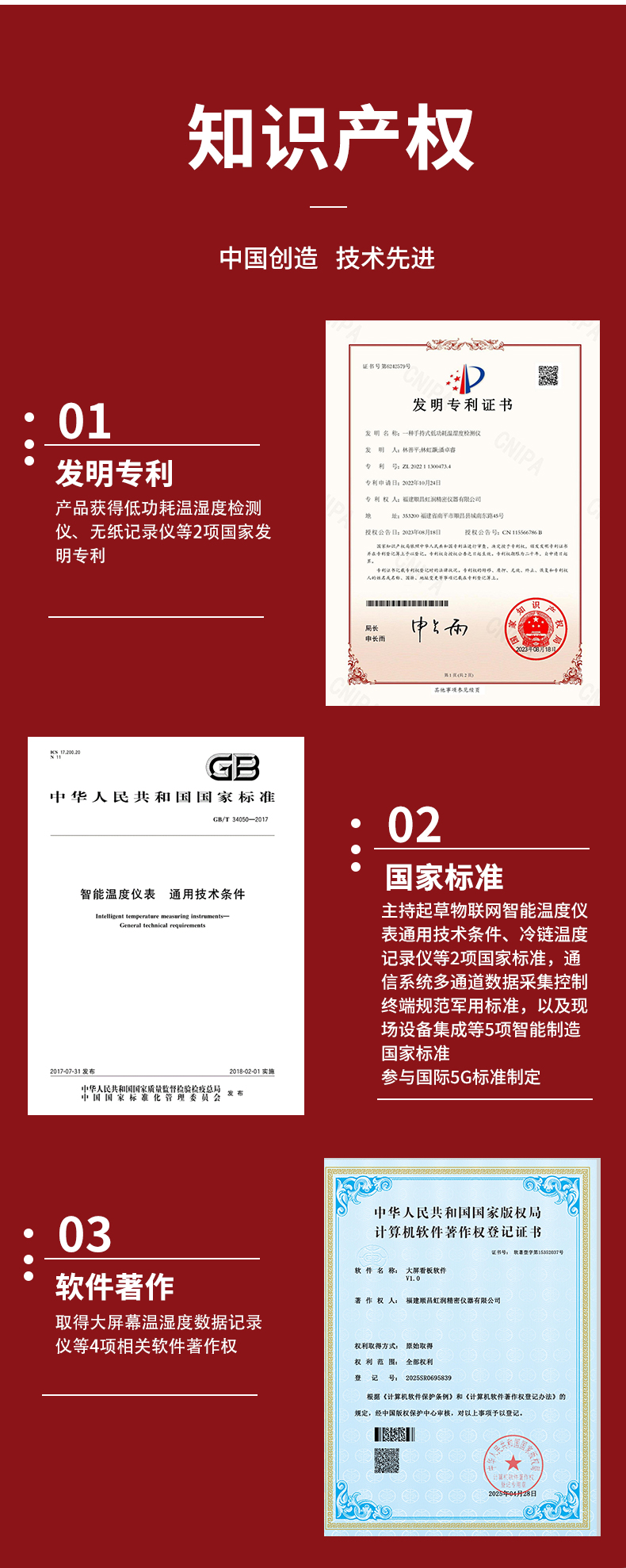 虹潤(rùn)公司是專業(yè)生產(chǎn)環(huán)境監(jiān)測(cè)儀表的國(guó)家專精特新“小巨人”企業(yè)。生產(chǎn)的大屏噪音溫濕度記錄儀,具有高清大屏顯示,數(shù)據(jù)記錄與轉(zhuǎn)存,同步觸發(fā)可靠預(yù)警,RS485或以太網(wǎng)通訊等特點(diǎn)。產(chǎn)品獲得一種手持式低功耗溫濕度檢測(cè)儀、無(wú)紙記錄儀等2項(xiàng)國(guó)家發(fā)明專利,主持起草物聯(lián)網(wǎng)智能溫度儀表通用技術(shù)條件、冷鏈溫度記錄儀等2項(xiàng)國(guó)家標(biāo)準(zhǔn),通信系統(tǒng)多通道數(shù)據(jù)采集控制終端規(guī)范軍用標(biāo)準(zhǔn),以及現(xiàn)場(chǎng)設(shè)備集成等5項(xiàng)智能制造國(guó)家標(biāo)準(zhǔn),參與國(guó)際5G標(biāo)準(zhǔn)制定,取得大屏幕溫濕度數(shù)據(jù)記錄儀等3項(xiàng)相關(guān)軟件著作權(quán)。產(chǎn)品廣泛應(yīng)用于電子制造、醫(yī)療科研、倉(cāng)儲(chǔ)管理、畜牧養(yǎng)殖、建筑工程等諸多領(lǐng)域。