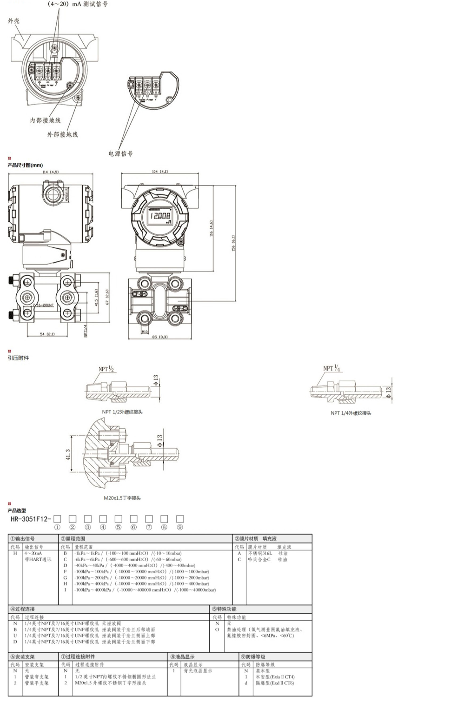 HR-3051F12智能單晶硅夾板式壓力變送器能準(zhǔn)確的測量壓力,并把它轉(zhuǎn)換成4~20mADC的輸出信號。該變送器可通過三按鍵本地操作,或通用手操器、組態(tài)軟件、以及手機(jī)APP遠(yuǎn)程操作,在不影響4~20mA DC的輸出信號的同時(shí),進(jìn)行顯示與組態(tài)。