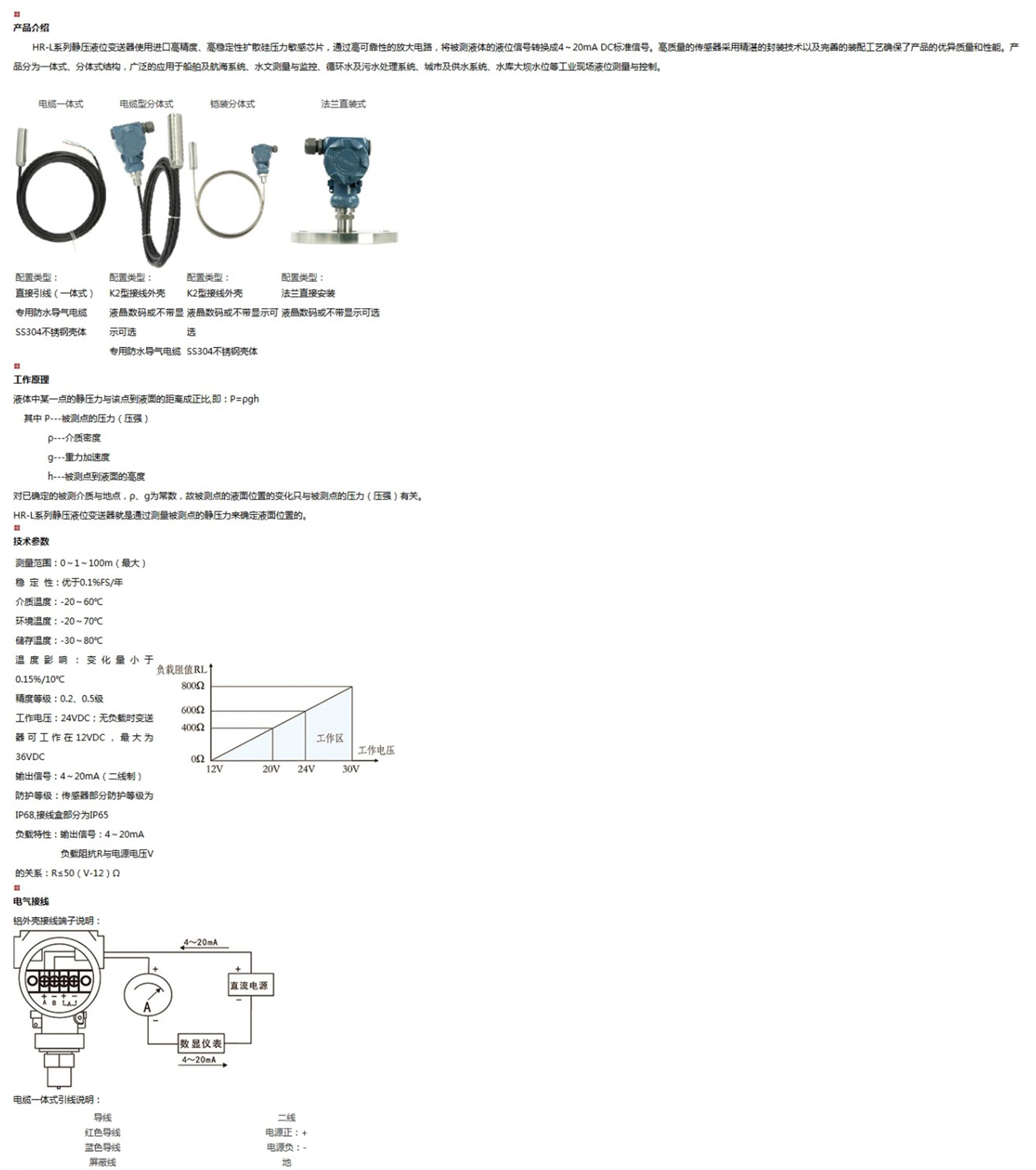 HR-L系列靜壓液位變送器使用進(jìn)口高精度、高穩(wěn)定性擴(kuò)散硅壓力敏感芯片,通過高可靠性的放大電路,將被測液體的液位信號轉(zhuǎn)換成4~20mA DC標(biāo)準(zhǔn)信號。